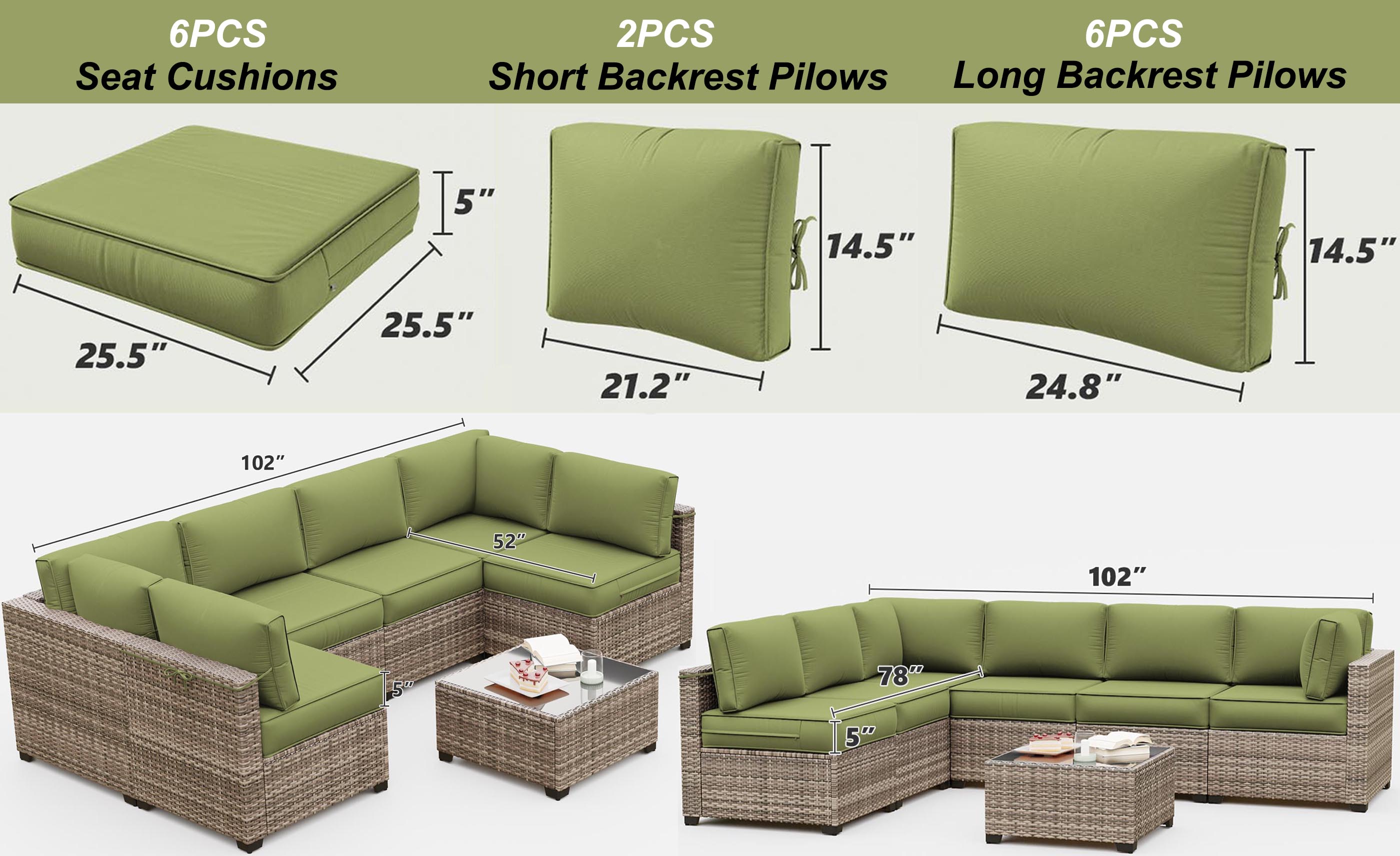 14PCS Patio Sectional Cushion Set, 5" thickness Grass Green